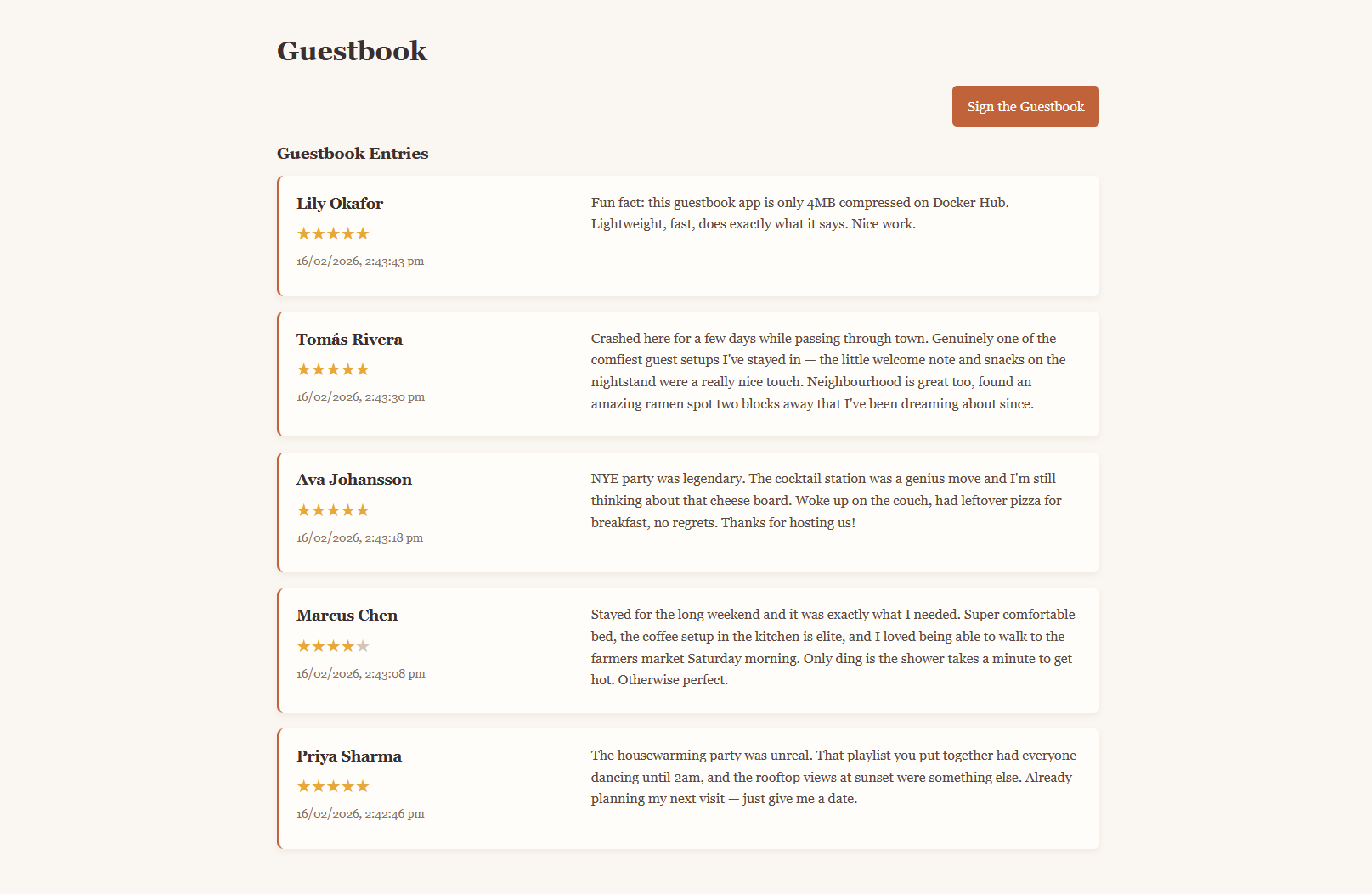 A lightweight, self-hosted guestbook app that lets guests leave star ratings and reviews. Built with Rust and SQLite, the Docker image compresses down to just a few MB.
